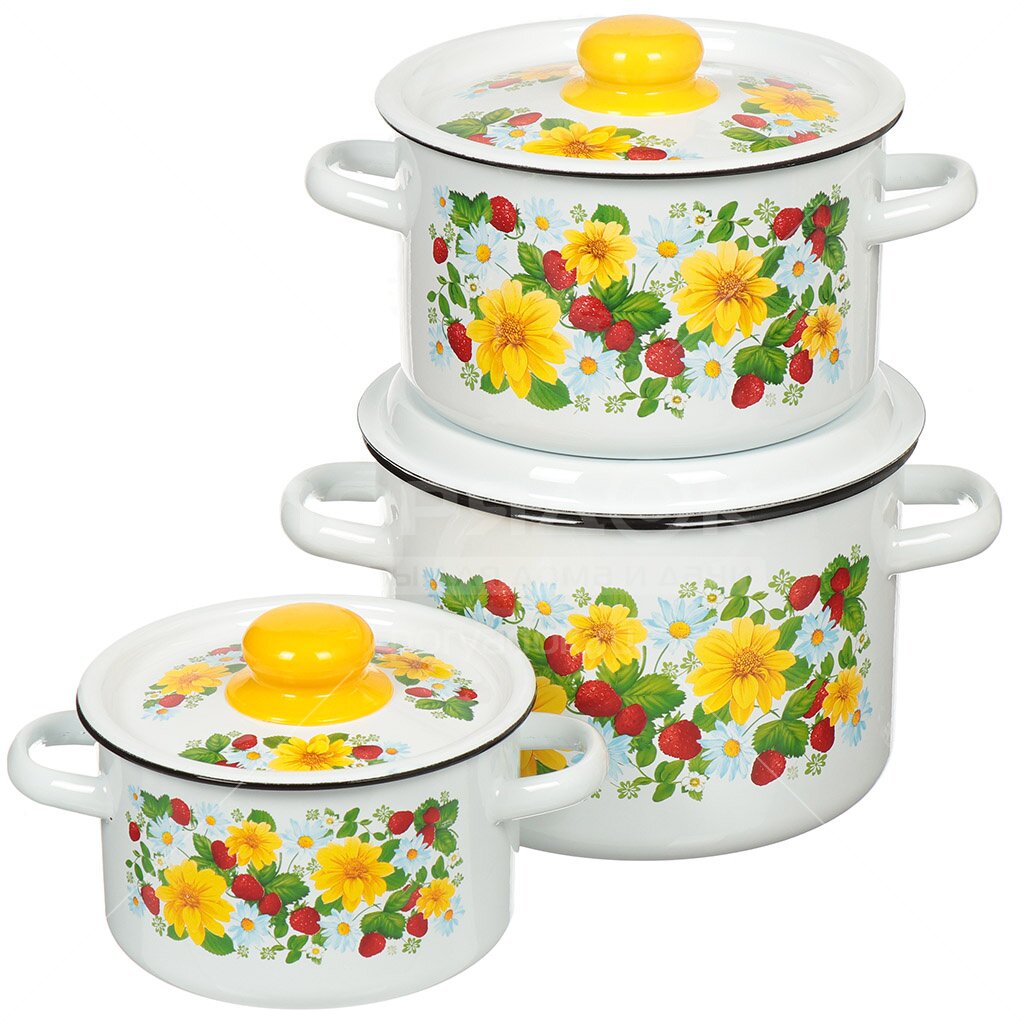 Набор эмалированной посуды СтальЭмаль Земляника 1с144 (кастрюля 1.5+2.9+4.5 л), 6 предметов