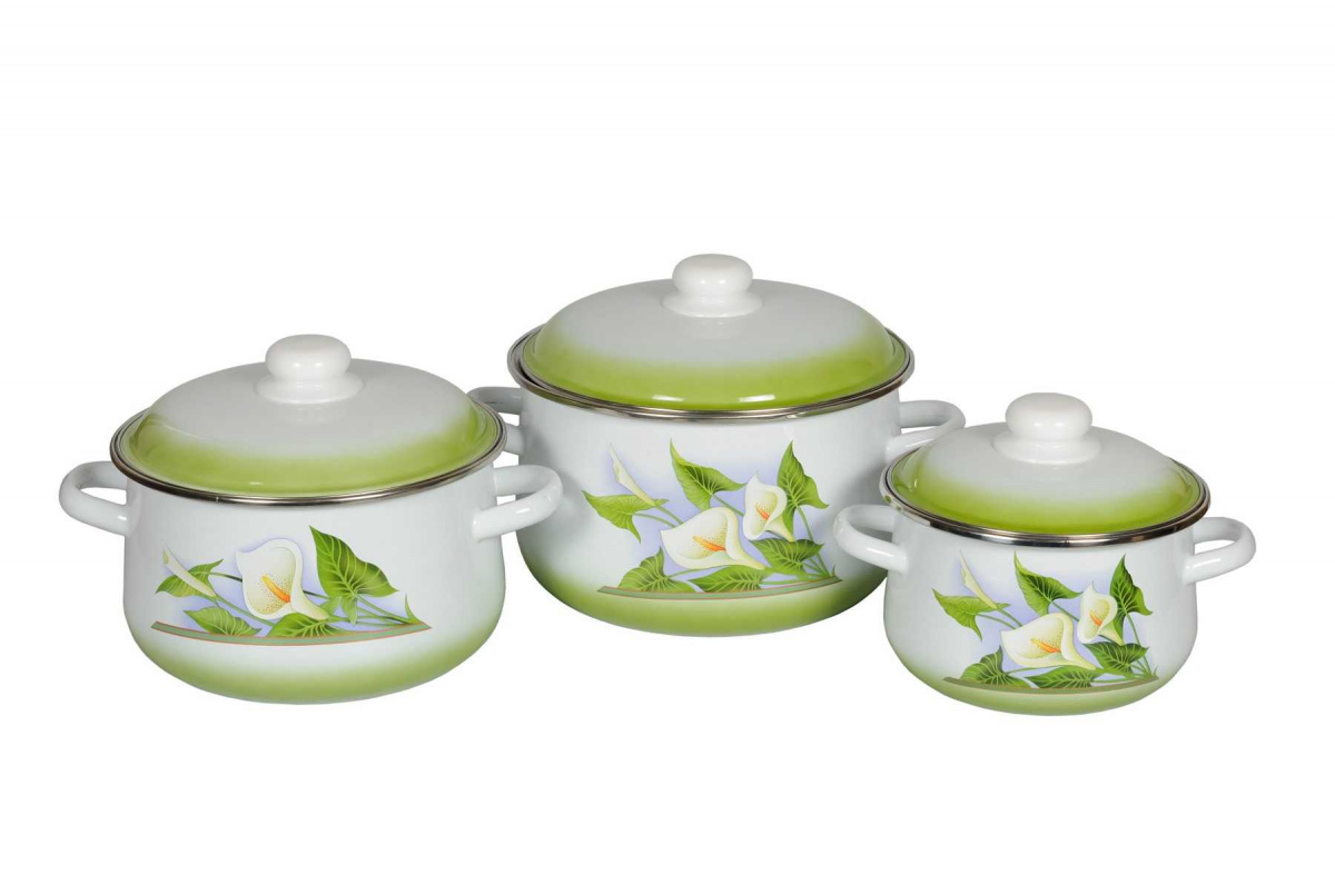 Состав: кастрюли конические 2,0 л, 4,0 л, 5,5 л. Диаметр кастрюль (по верхнему краю): 175 мм, 215 мм, 235 мм. Высота стенок кастрюль: 110 мм, 130 мм, 145 мм. Ободок из нержавеющей стали по краю кастрюль. Изделия выполнены из качественной эмалированной стали. Эмаль защищает сталь от коррозии, придает посуде гладкую поверхность и надежно защищает от кислот и щелочей. Эмаль устойчива к пищевым кислотам, не вступает во взаимодействие с продуктами и не искажает их вкусовые качества. Прочный стальной корпус обеспечивает эффективную тепловую обработку пищевых продуктов и не деформируется в процессе эксплуатации. Кастрюли снабжены стальными крышками с пластиковыми ручками. При эксплуатации на газовых плитах пламя горелки следует отрегулировать таким образом, что бы огонь не выходил за пределы дна посуды.