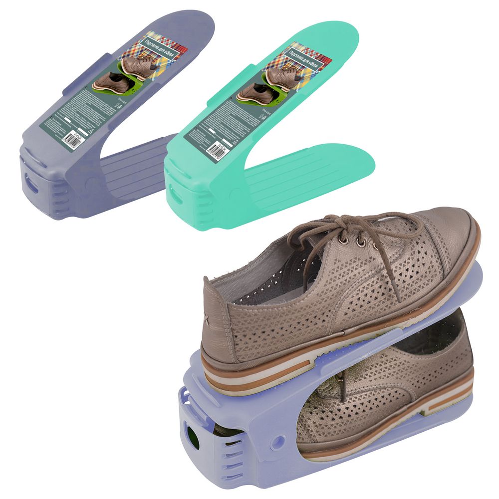 Чтобы обувь занимала меньше места в прихожей или в шкафу, используйте подставку. С такой подставкой можно разместить вдвое больше пар обуви на полках или в гардеробной. Конструкция представляет собой две поверхности — верхнюю наклонную и нижнюю прямую. Внизу размещается одна часть пары, сверху — вторая. Чтобы избежать соскальзывание, в нижней части изделия есть упор.