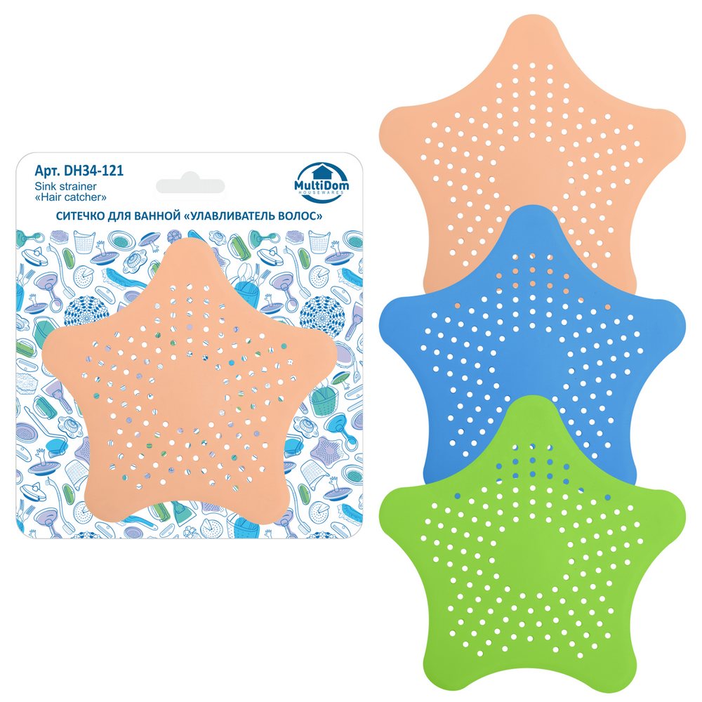 Ситечко выполнено в форме звезды ярко-зеленого, голубого, синего и оранжевого цветов. Оригинальный дизайн украсит вашу ванную комнату или кухню. Изделие изготовлено из TPR – прочного материала, способного длительное время подвергаться воздействию влаги. Размер 15х15 см.