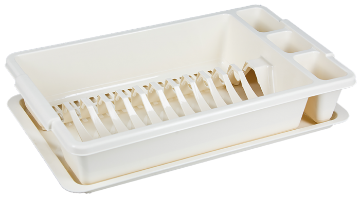 Сушилка для посуды состоит из верхнего яруса на 12 тарелок и с тремя отделениями для столовых приборов, а также в комплекте есть поддон для сбора воды.