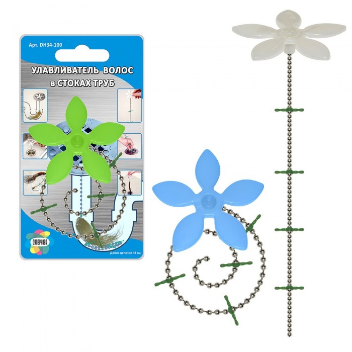 цепочка выполнена из металла, на ней установлены силиконовые ограничители. В процессе эксплуатации волосы и прочий мусор скапливаются на ограничителях и не проникают дальше в канализацию;
